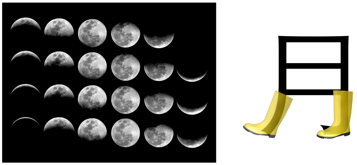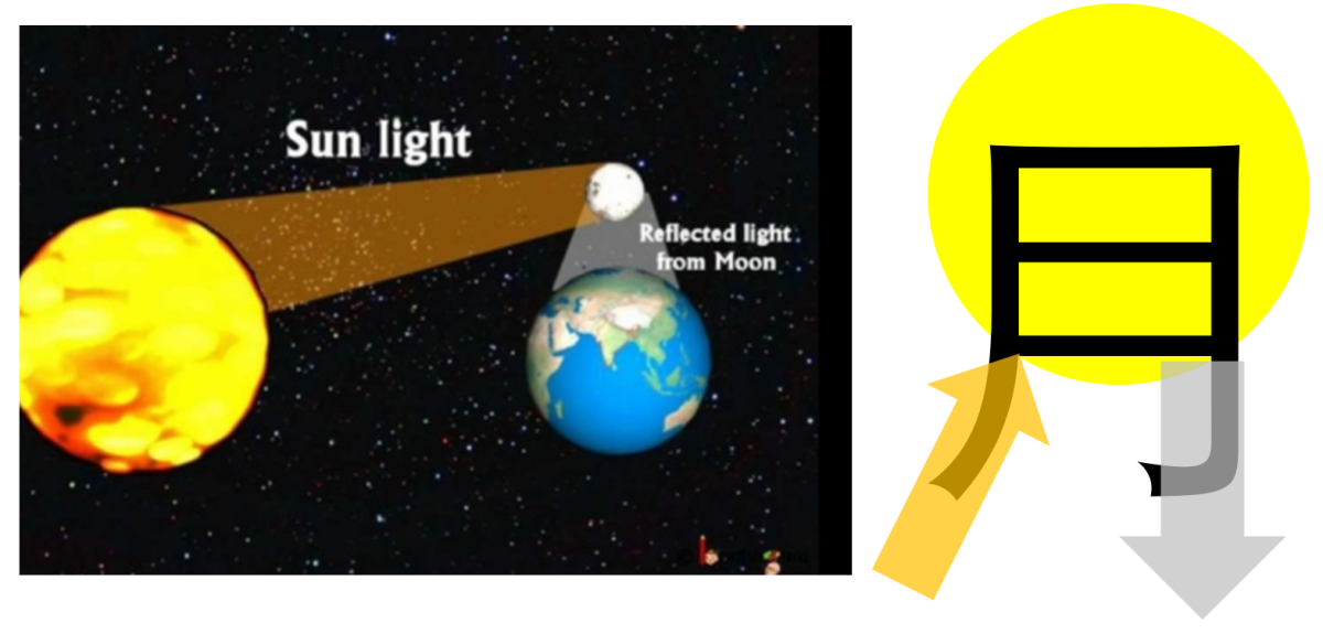 - Pour le retenir, on peut visualiser un croissant de lune, les rayons solaires qui se servent de la lune comme miroir, ou encore le Hanzi 日 portant de jolies bottes jaunes