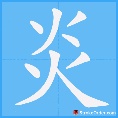 - 炎 correspondrait à ce que les praticiennes et praticiens en médecine traditionnelle chinoise, appellent un "excès de feu" : des manifestations concrètes sont visibles, telles que de véritables flammes, ou une inflammation sur le corps humain (rougeurs par exemples)
