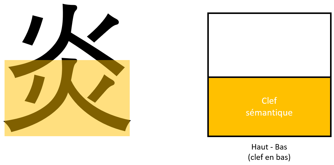 - La clef sémantique est celle du feu, elle occupe la moitié basse du Hanzi