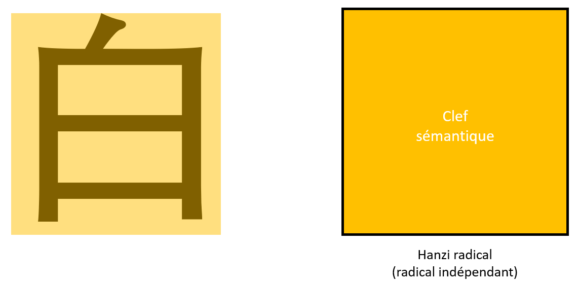 - Sa structure est celle d'un Hanzi radical (il est sa propre clef sémantique)
