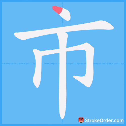 Son trait central traverse en effet tout le Hanzi : il n'y a pas de couvercle, le radical 一 croise directement 巾 en partie haute.
