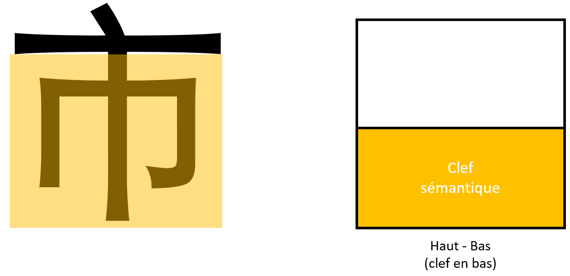 - La clef sémantique est celle de l'écharpe, elle occupe la partie basse du Hanzi