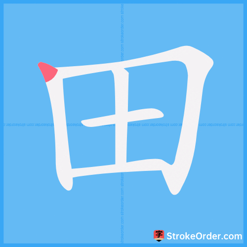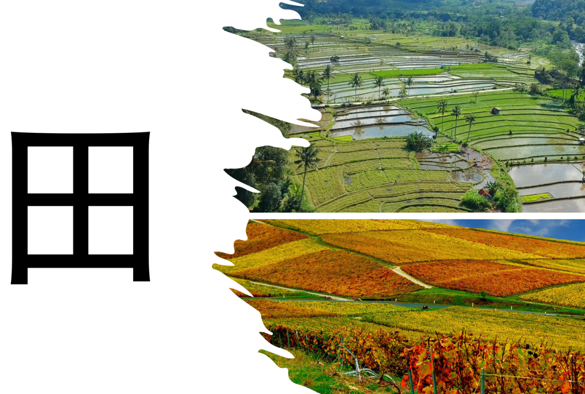Initialement, ce Hanzi signifie "rizière", mais on lui concède volontiers le sens plus large de "champ".