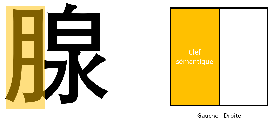 - La clef sémantique est celle du corps (nous utiliserons le sens dérivé de "organe"), elle occupe la partie gauche du Hanzi