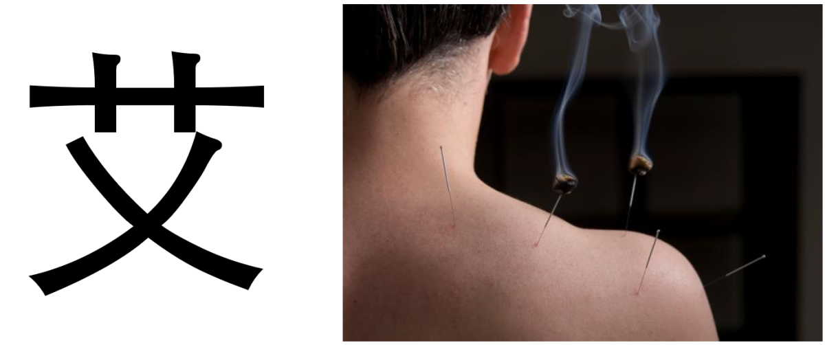 Ce Hanzi est pratiquement un pictogramme : on voit la moxa (clef du végétal) au-dessus d'aiguilles (les traits en croix du dessus).