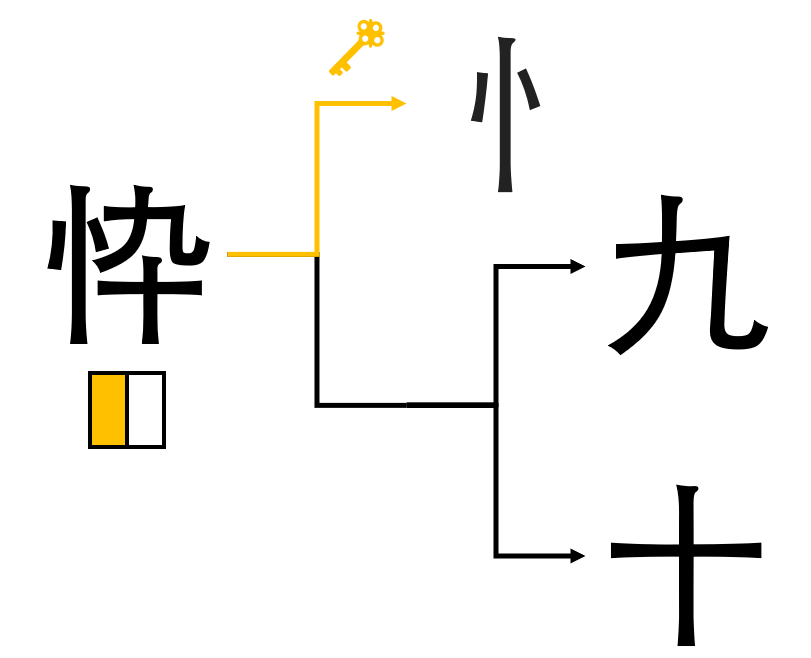 En effet, ce qui ressemble à un composé en partie droite n'en est pas un : il s'agit simplement de 九 et 十 superposés sans lien particulier entre les deux radicaux.