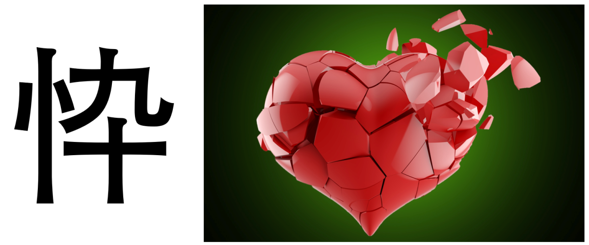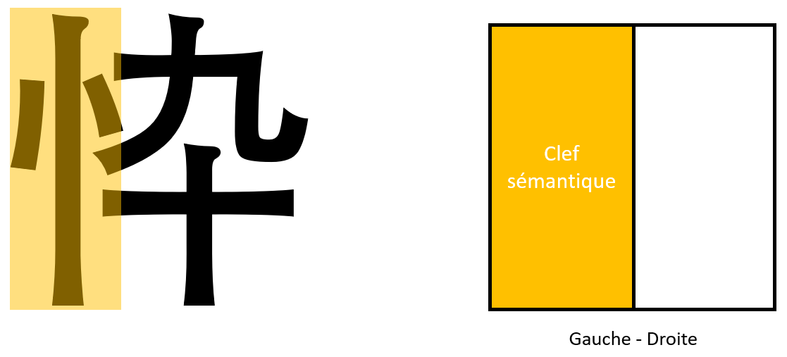 - La clef sémantique est celle du cœur, elle occupe la partie gauche du Hanzi