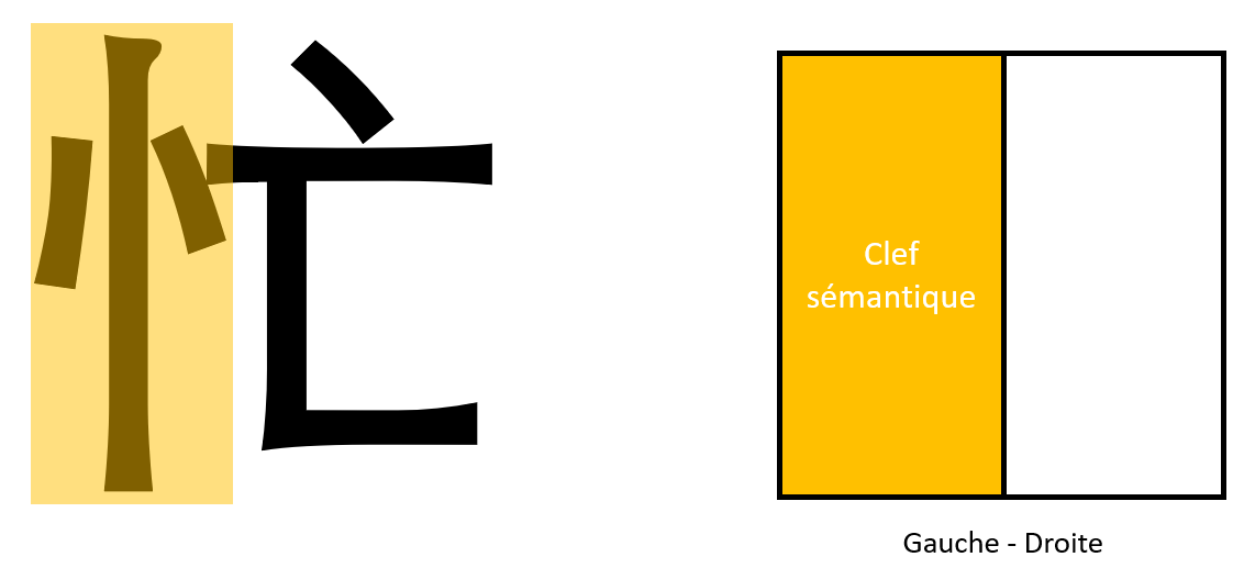 - La clef sémantique est celle du cœur, elle occupe la partie gauche du Hanzi