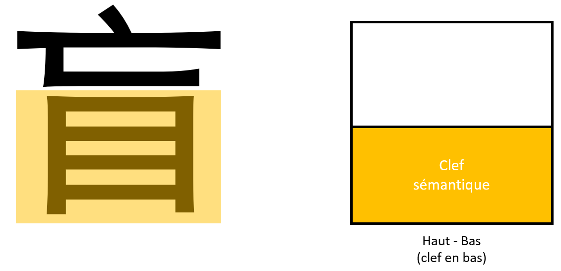 - La clef sémantique est celle de l'œil, elle occupe la partie basse du Hanzi