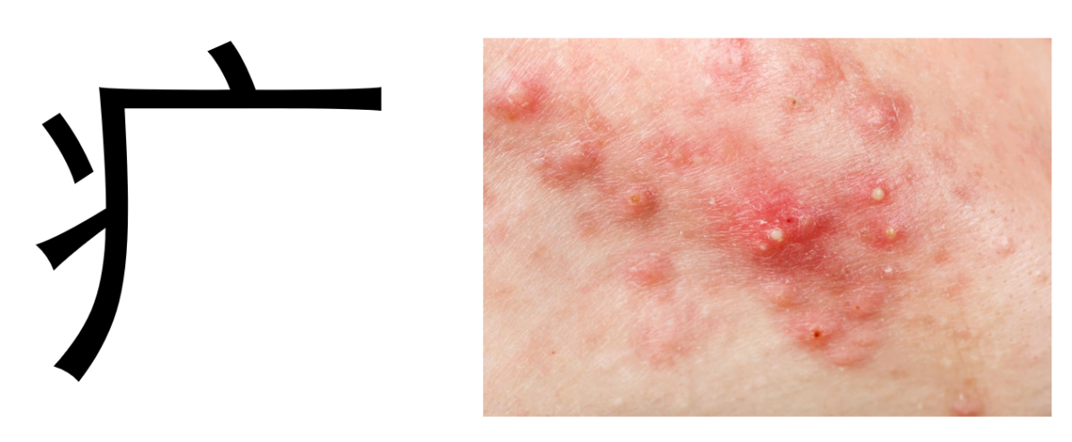 - La clef sémantique est celle de la maladie, elle occupe les côtés gauche et haut du Hanzi