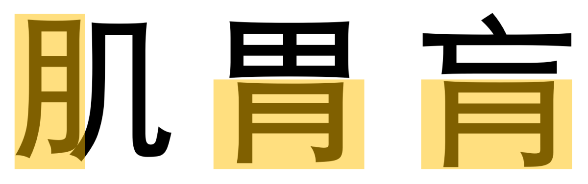 Par exemple, on voit que le radical 肉 viande / chair a tendance à dominer la plupart de ses congénères et à prendre le rôle de clef assez facilement.