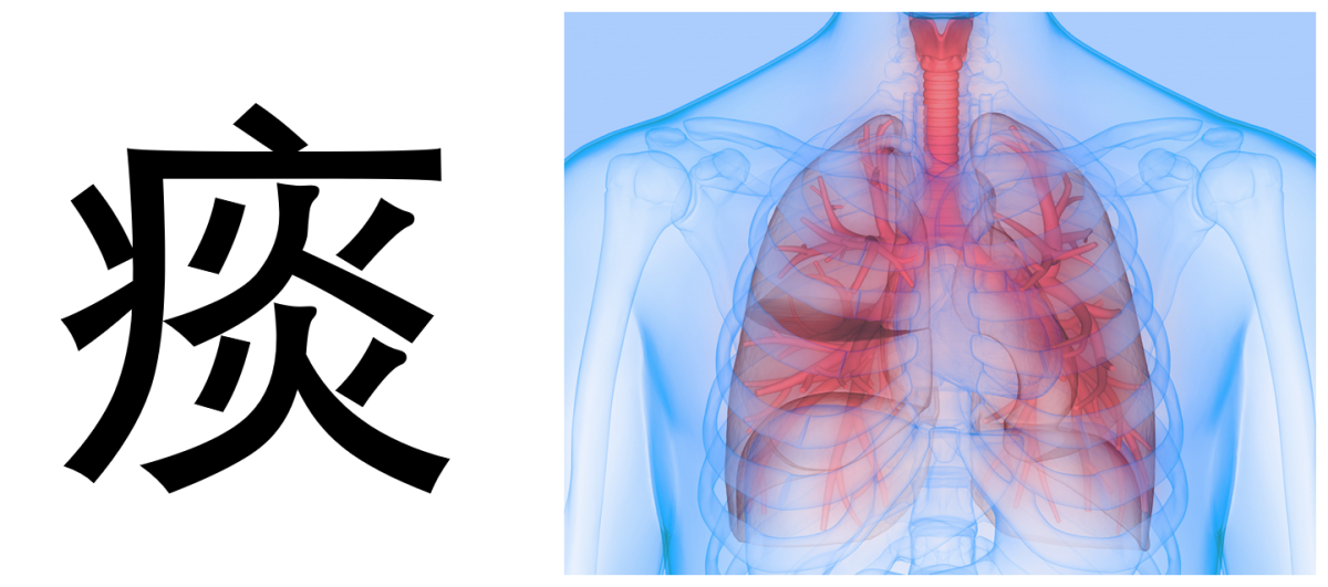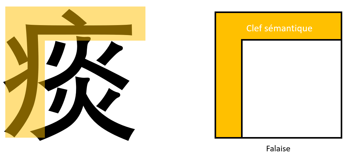 - La clef sémantique est celle de la maladie, elle occupe les côtés gauche et haut du Hanzi