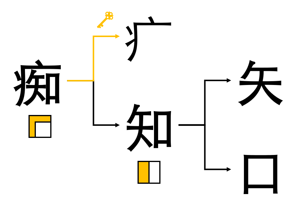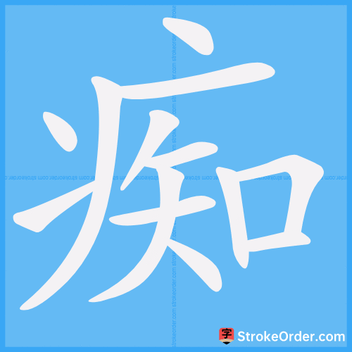 Pour tracer ce Hanzi de 13 traits, il suffit de tracer la clef de la maladie, puis savoir, connaître 知 (flèche + bouche) à l'intérieur.