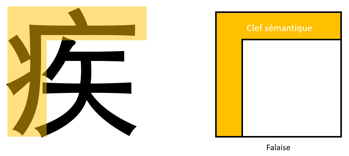 - La clef sémantique est celle de la maladie, elle occupe les côtés gauche et haut du Hanzi