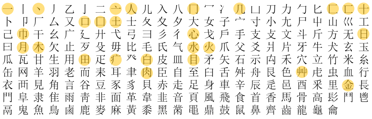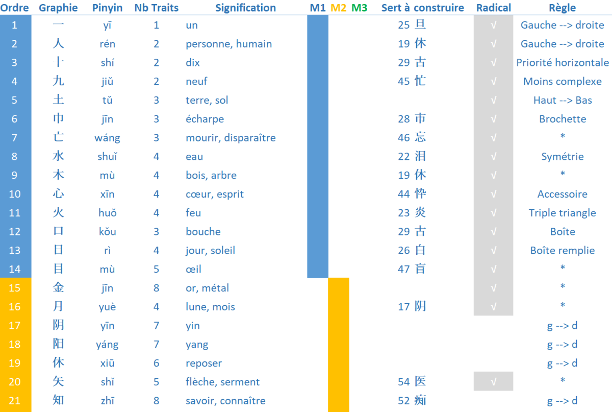 Ces radicaux sont simples (beaucoup plus que certains caractères que nous avons appris ensemble) et faciles à retenir (la plupart sont des pictogrammes : il suffit de faire une analogie avec le monde observable pour les mémoriser).
